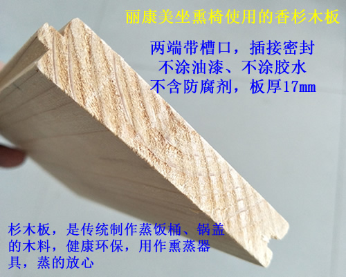 1、 坐熏椅的框架采用北美进口松木制作。坐熏椅的蒸箱,选用树龄30年以上的香杉木板企口插接制作,不刷油漆和胶水,确保材质健康环保。